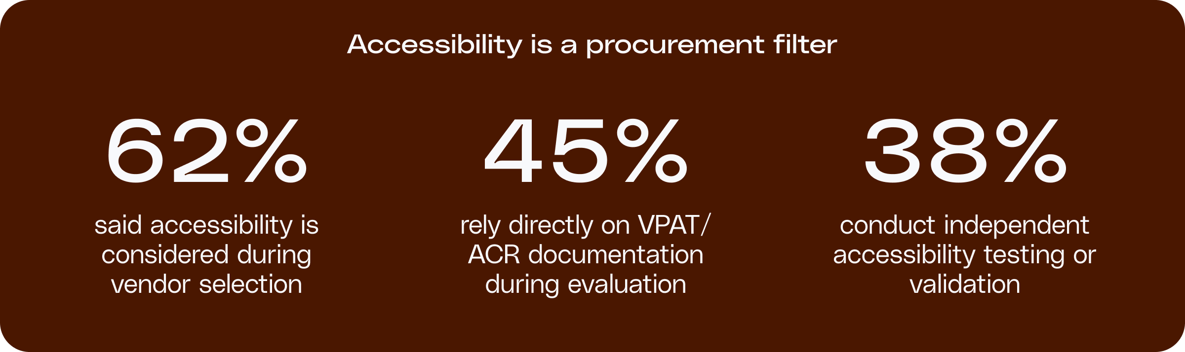 This isn’t theoretical. In our survey of public institutions, 62% said accessibility is consistently considered when selecting or renewing digital vendors, 45% rely directly on VPAT/ACR documentation during evaluation, and 38% conduct independent accessibility testing or validation. Accessibility is no longer assumed — it’s reviewed, documented, and increasingly verified before contracts move forward.